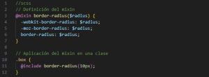 - Mixin: Es un bloque de código que se puede reutilizar en diferentes partes del archivo. Esto permite escribir estilos comunes una vez y aplicarlos en cualquier lugar, pasando parámetros para personalizar su comportamiento.